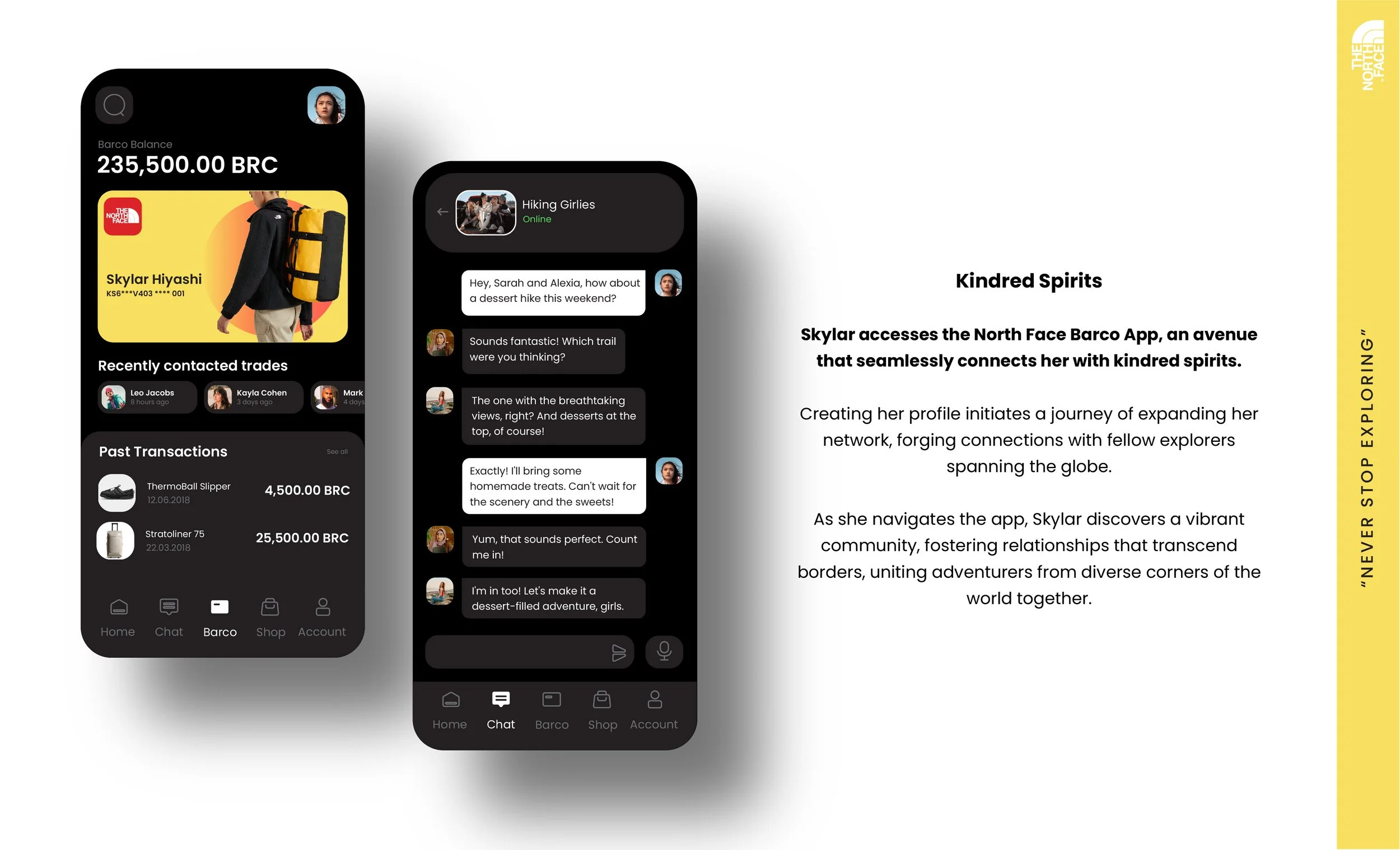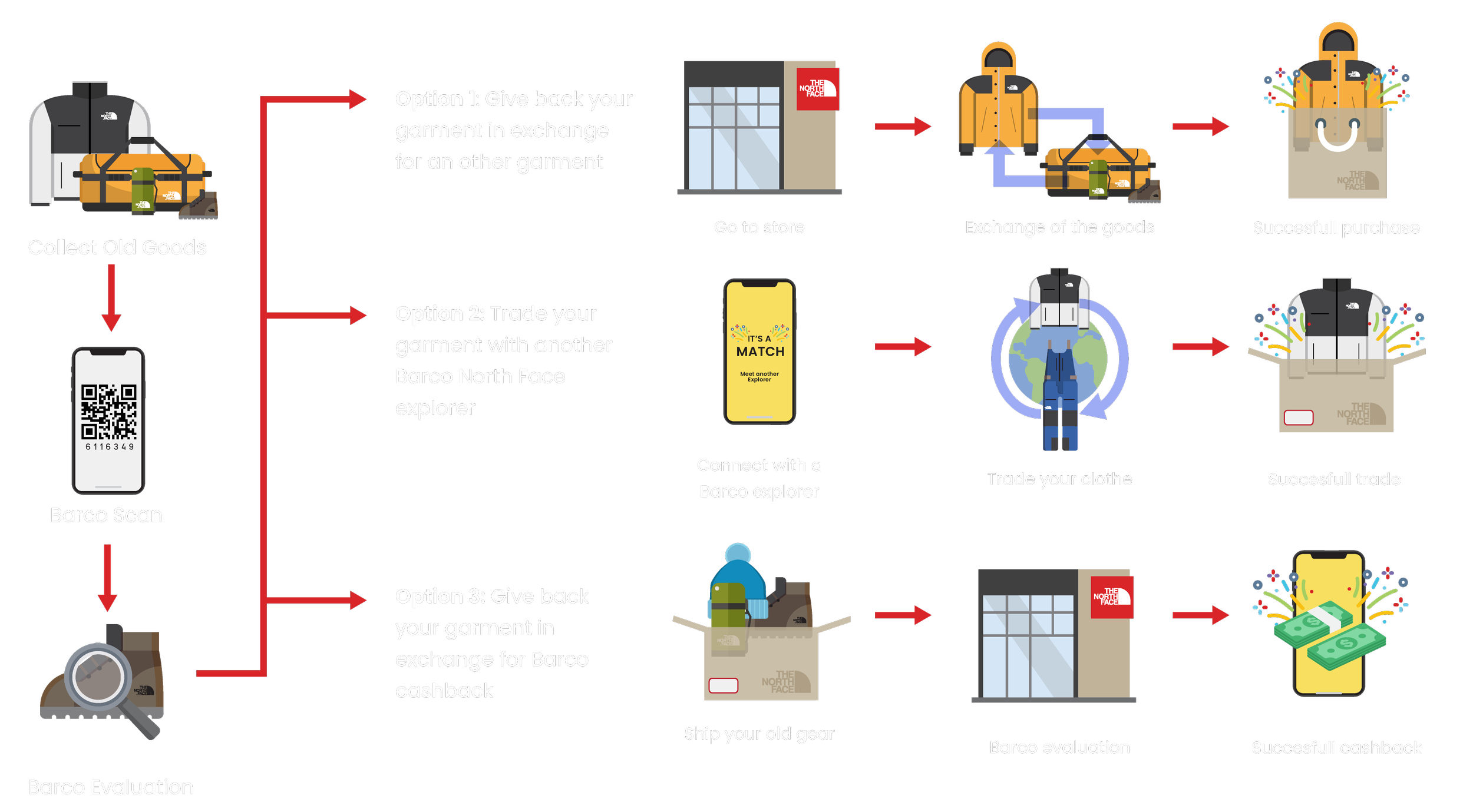 Rather than discarding their new clothing items, North Face would integrate Barco into their brand. This innovative approach enables their customers to exchange their old garments for brand-new ones or trade them with fellow North Face enthusiasts. In this system, the clothes' worth is not determined by monetary value but by the narratives of North Face explorers and the stories behind the garments, thus giving these clothing items a new lease of life.