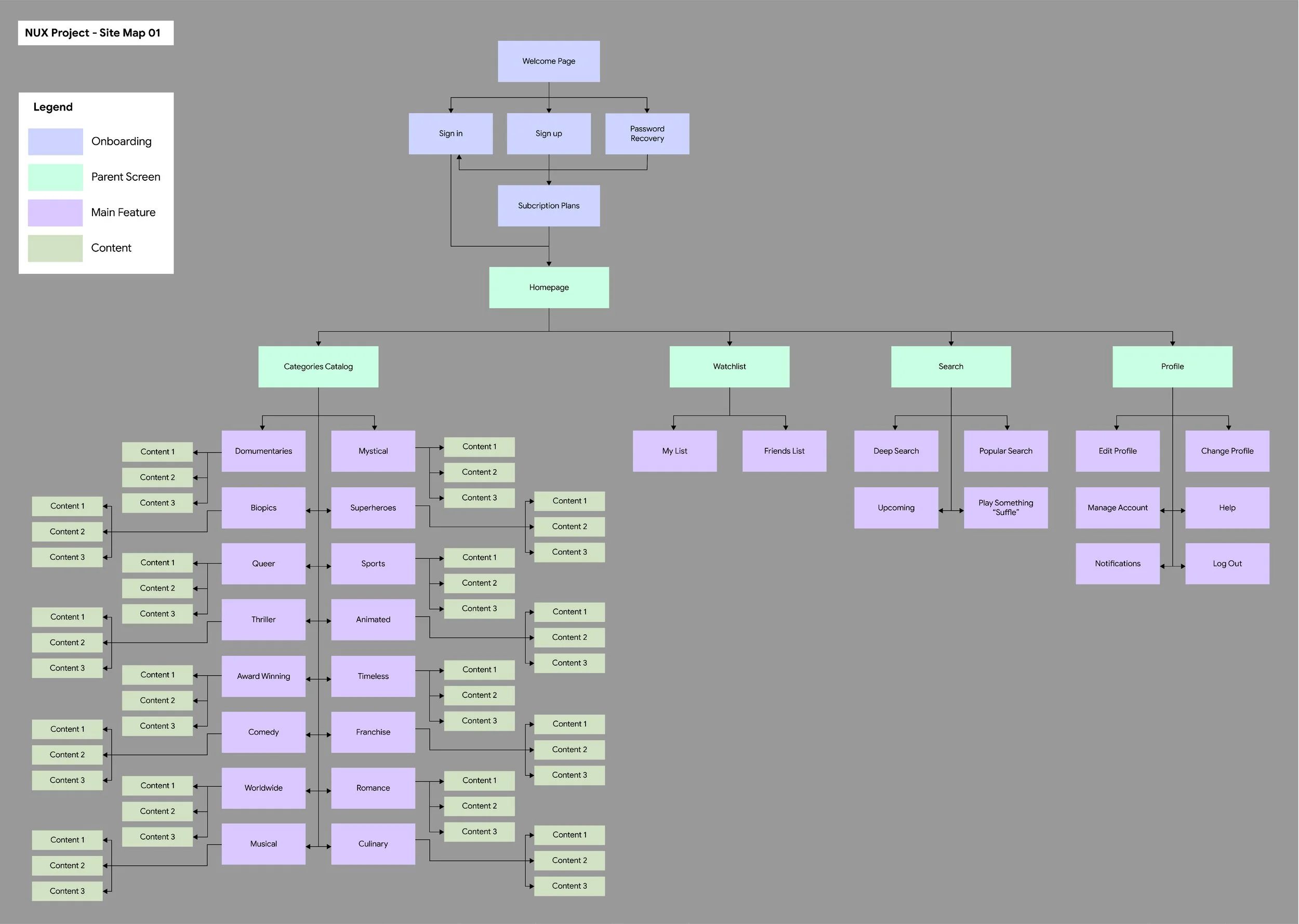 During my tree testing and reviewing process, which took a total of 8 days and 2 iterations, I gained valuable insights into information architecture and organizing a site map. While my first site map allowed users to access the content they needed, I realized that the abundance of categories was affecting its usability. For example, categories like suspense, thriller, and crime were understood by users, but they seemed too similar and slowed down the navigation process. Additionally, I learned that users associate their movie watchlist with their user profile. This confusion affected the social element of the platform which was needed for my persona.