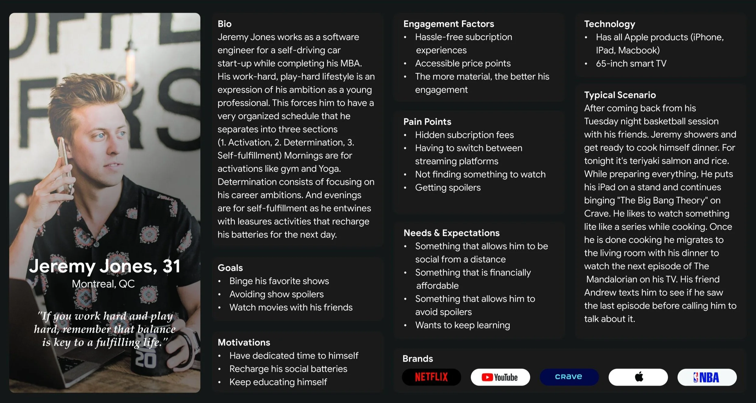 After conducting four semi-structured interviews, each comprised of 12 questions that focused on users' streaming intentions, habits, and desires, I created the persona of Jeremy Jones. The purpose behind this authentic archetype is to serve as a guiding influence in the project's development.