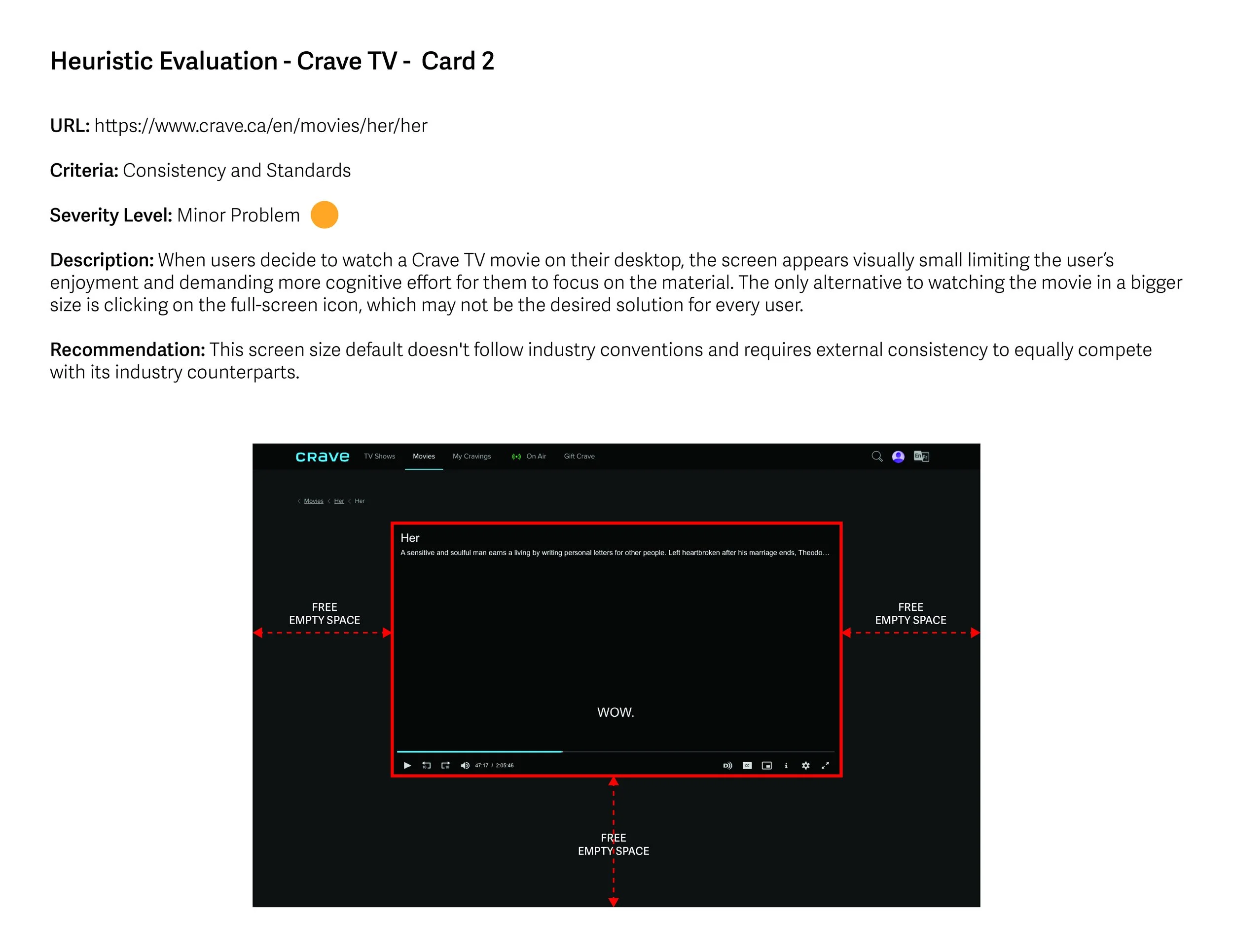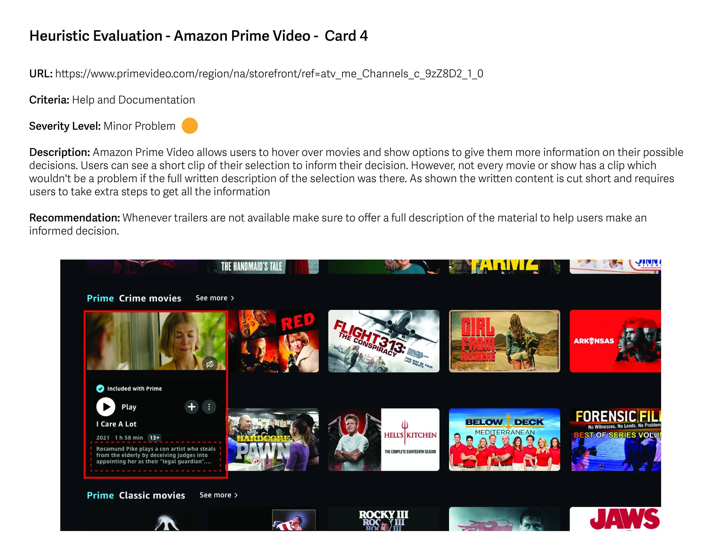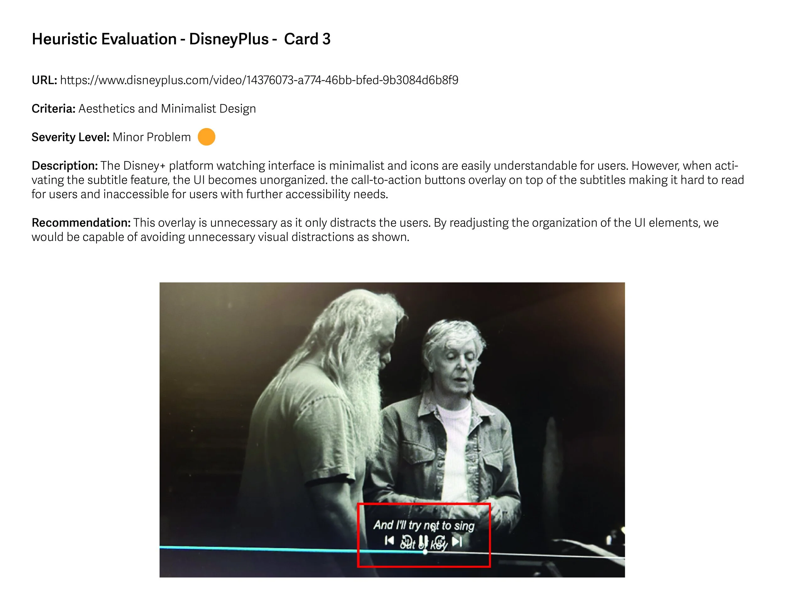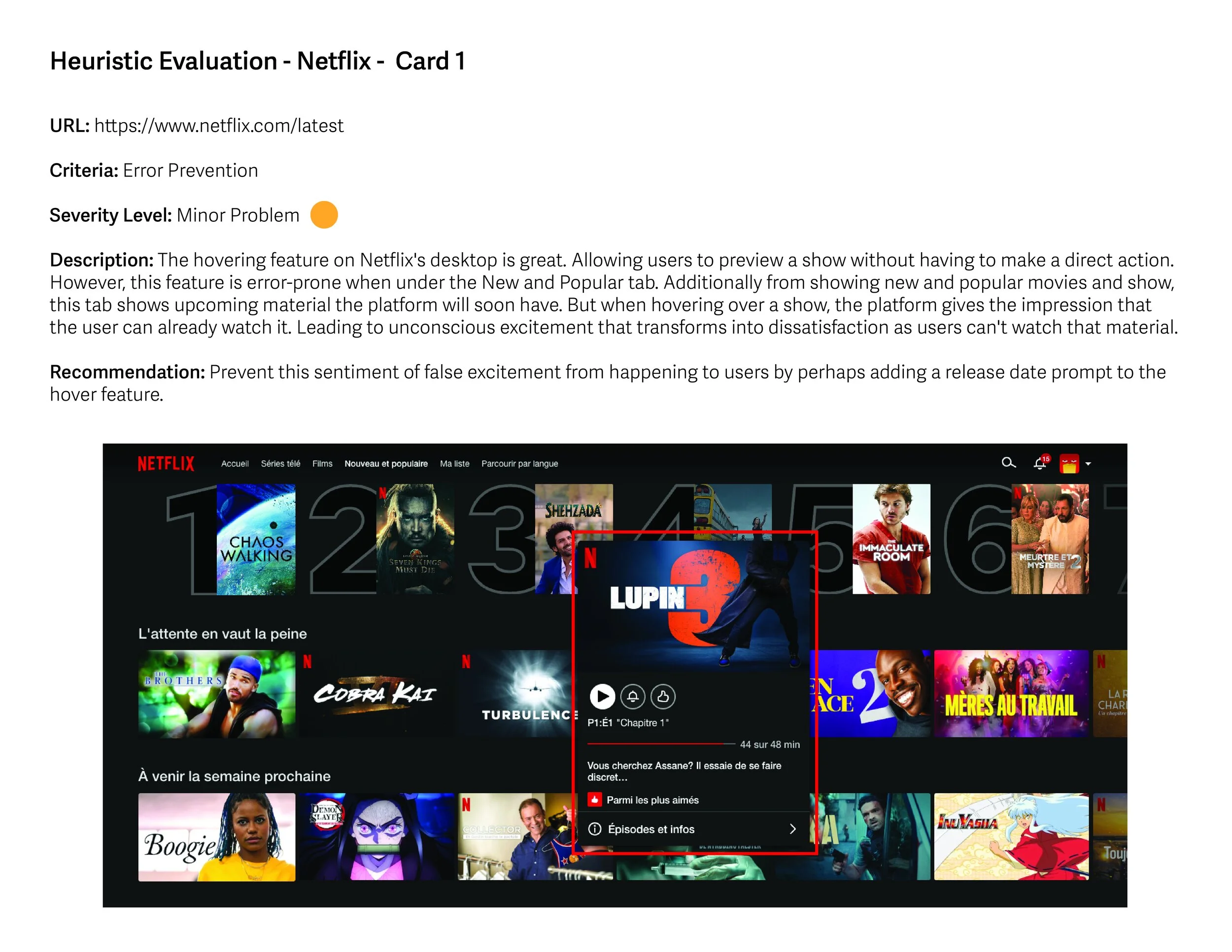 In the initial phase, I conducted a heuristic evaluation of several streaming competitors' benchmarked platforms, aiming to identify various usability issues using Nielsen's ergonomic criteria. In the following five slides, you'll discover five distinct observations categorized by their severity levels.