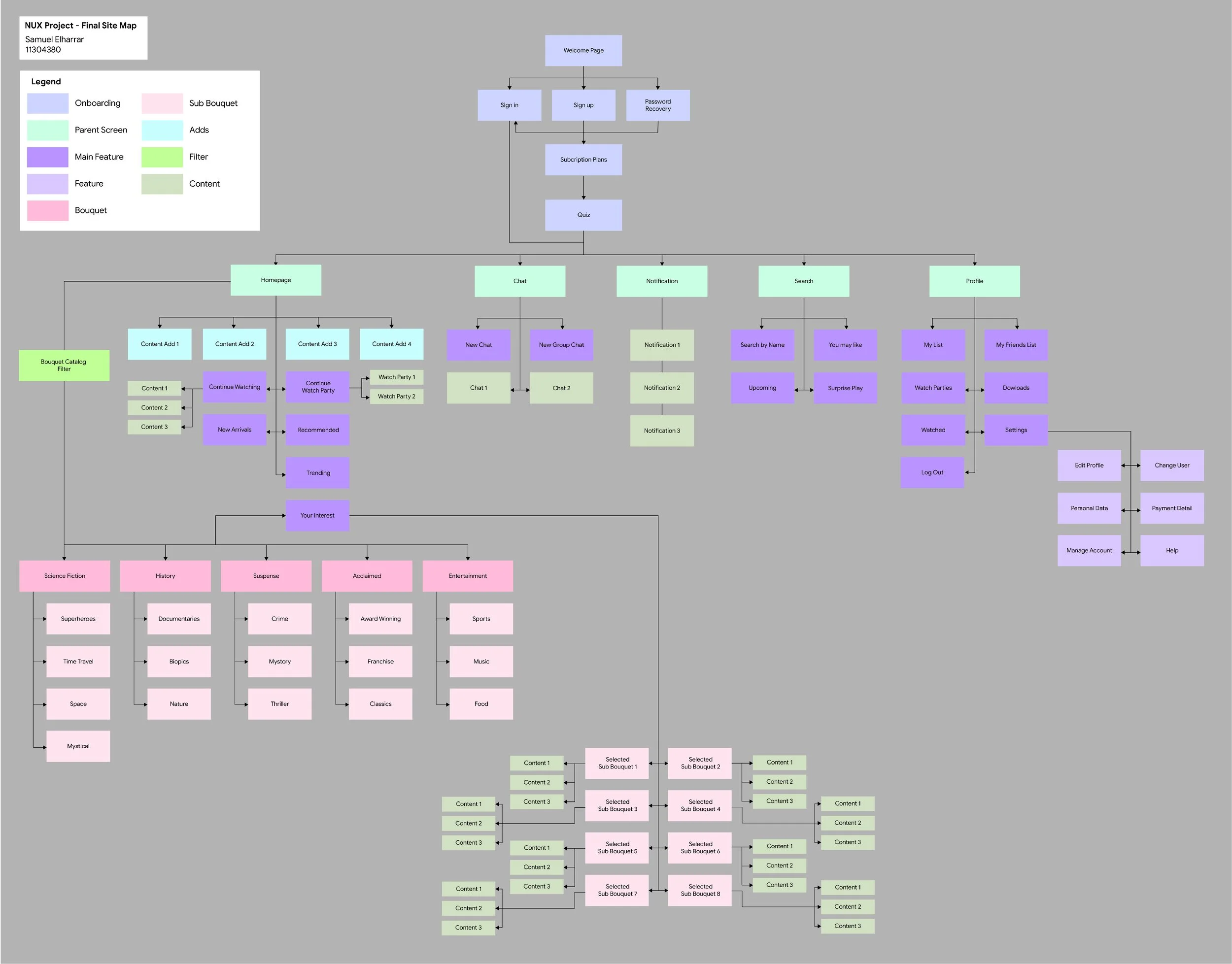 Second, I integrated the watchlist with the user profile to enhance the social experience, allowing users to easily track and share their favourite movies and shows with their network, making the platform more interactive. This resulted in the final site map.