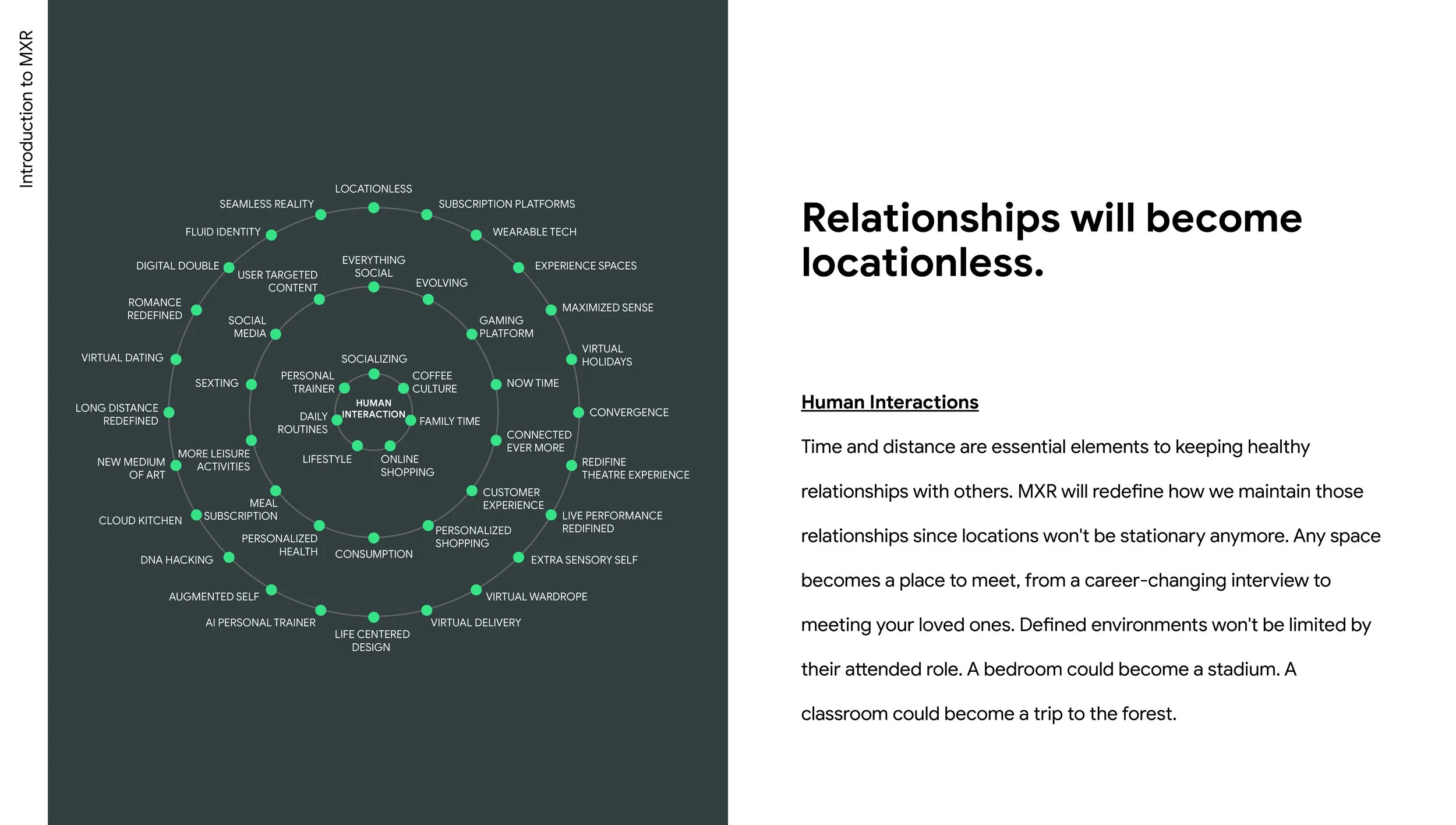 Findings from our initial investigation reveal that the integration of Virtual Reality (VR) and Augmented Reality (AR) in Mixed Reality (MR) is poised to revolutionize communication, transforming the interaction between humans and computers. While traditional communication methods have fostered connectivity, MRX presents a paradigm shift. MXR is set to redefine our understanding of distance, rendering it nearly irrelevant. Unable to attend Coachella this year? MXR will transport the Coachella digital space experience directly to you. The dynamics of maintaining meaningful relationships and crafting novel experiences will undergo a revolutionary change, as the concept of distance becomes abstract in this new era.